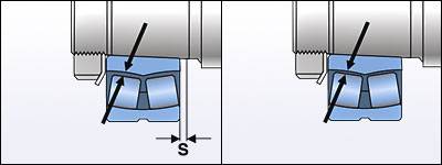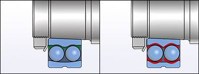 | Правильный монтаж – при осевом смещении подшипника на требуемую величину достигается правильный зазор. | Неправильный монтаж - подшипник смещён слишком далеко и зазор слишком мал, возможно повреждение подшипника. |