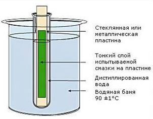 стандарту DIN 51 807 часть 1. Исследуемая смазка наносится на стеклянную пластину, помещаемую в пробирку наполненную дистиллированной водой. Пробирка ставится в водяную баню с заданной температурой на три часа. Изменение вида смазки оценивается визуально по шкале от 0 (изменений нет) до 3 (сильные изменения) при заданной температуре.
