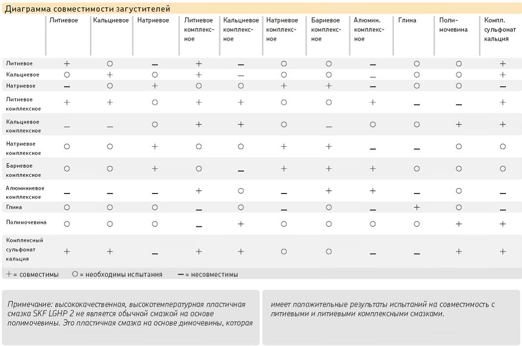 Примечание: высококачественная, высокотемпературная пластичная смазка SKF LGHP 2 не является обычной смазкой на основе полимочевины. Это пластичная смазка на основе димочевины, которая имеет положительные результаты испытаний на совместимость с литиевыми и литиевыми комплексными смазками.